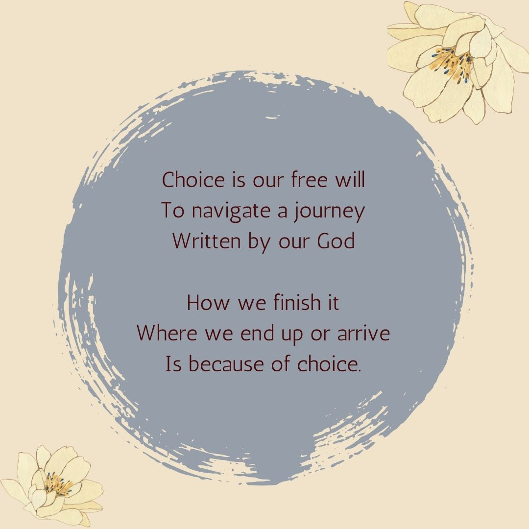 I offer the Lord gives us the gift of choice and free will. These moments come to us throughout our journey, often persuading or enticing us in some direction, great or small, that might have significant repercussions or gentle redirects. We may not even realize what choices made the most impact on the life we live. But, we all have choices along this journey. And depending on where we are when our choices are presented, our journey is perceived as blessed or not so blessed.